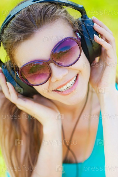 Молодая женщина в наушниках на фоне травы
