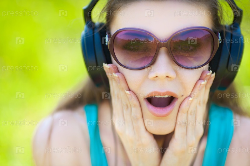 Молодая женщина в наушниках на фоне травы