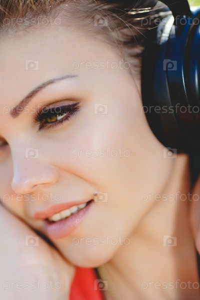Молодая женщина в наушниках на фоне травы