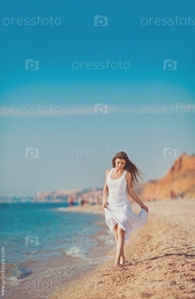 Девушка в белом гуляет по пляжу