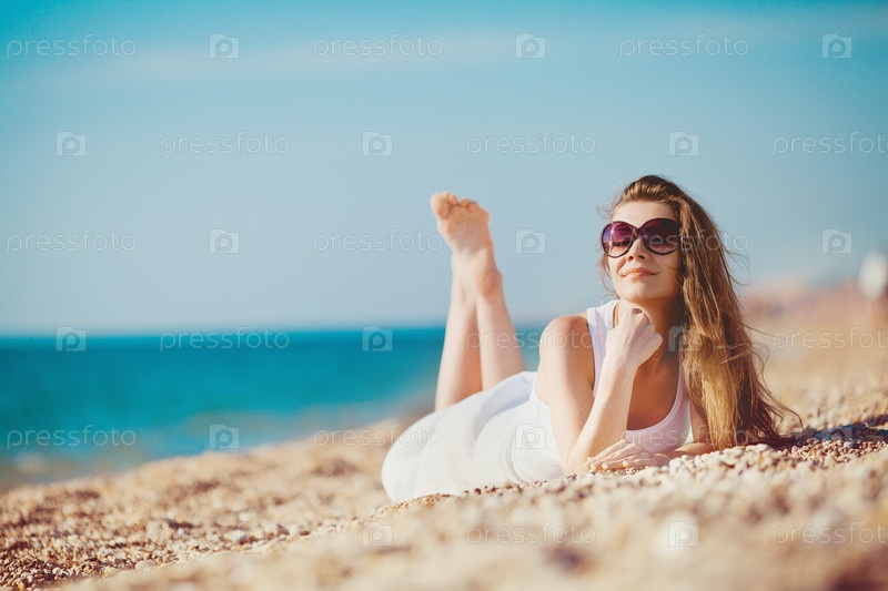Девушка на пляже в белоснежном платье