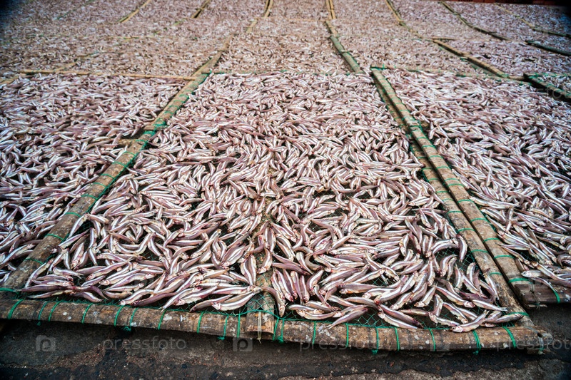 Планты маленьких анчоуса рыбы, сушка на открытом воздухе