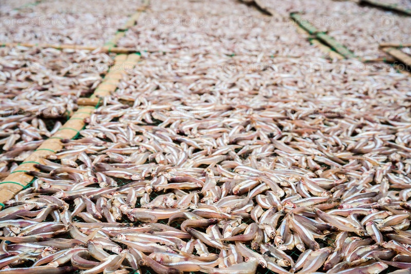 Много маленьких анчоусов сушится на открытом воздухе