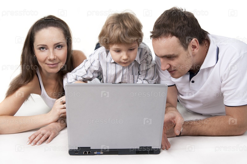 Молодая семья с ноутбуком на белом фоне