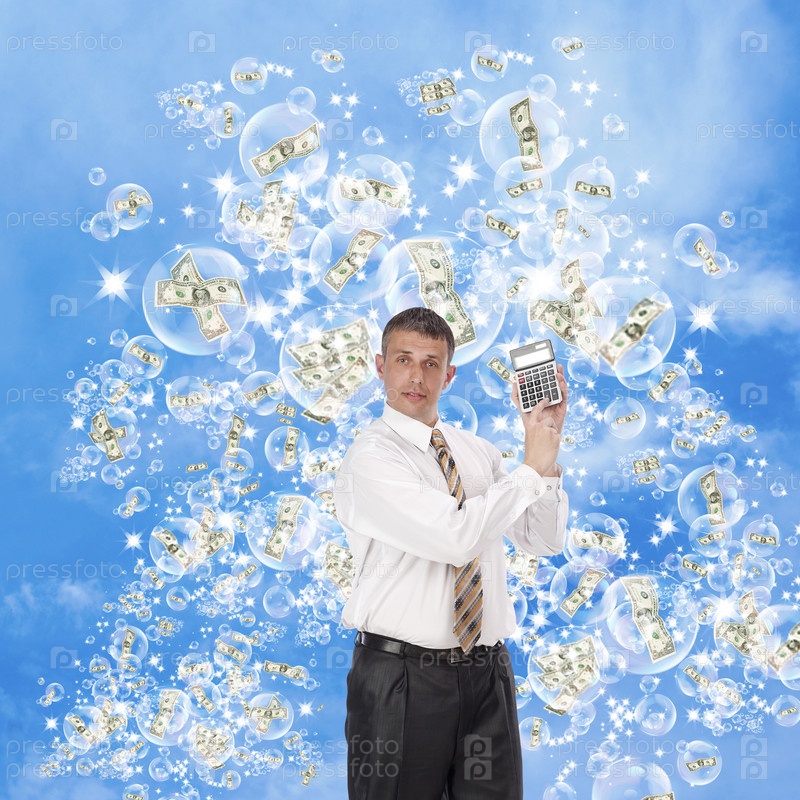 Бизнесмен с калькулятором на голубом фоне. Вокруг него мыльные пузыри, в пузырях доллары