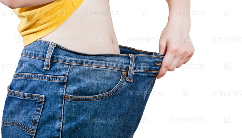 Стройная женщина меряет старые джинсы