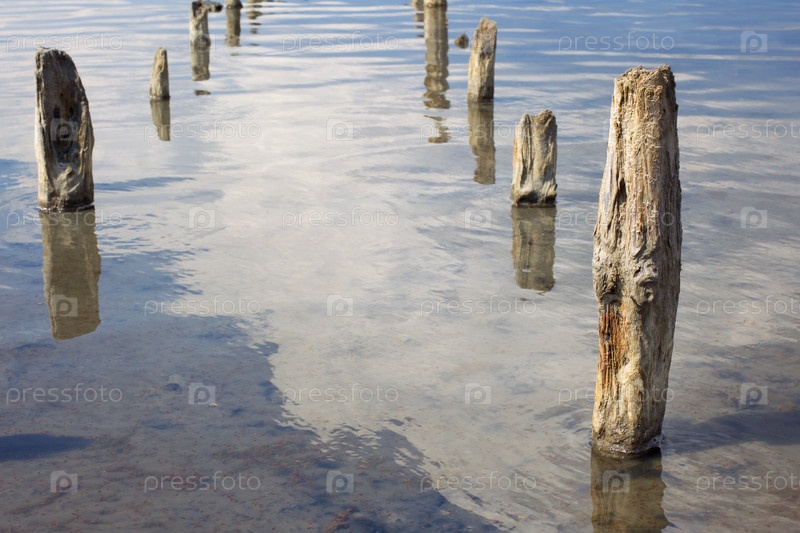 Старые деревянные столбы и ракообразные артемии в соленой воде Мертвого моря