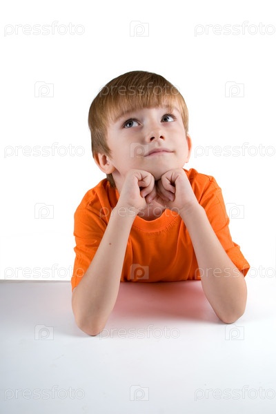 Задумчивый мальчик на белом фоне