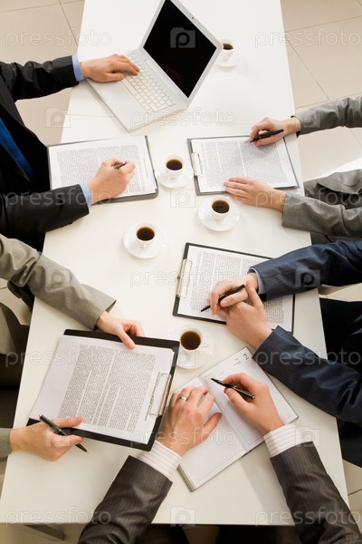 Изображение деловых людей, руки которых держат шариковые стрелки и пишут на бумаге во время планирования работы