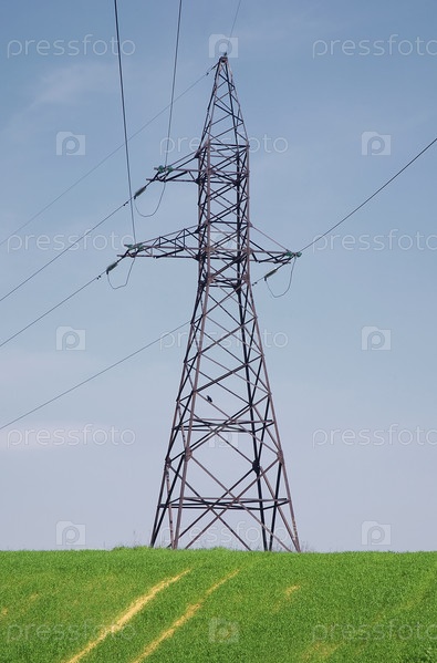 Опора линии электропередачи на зеленом поле на фоне голубого неба