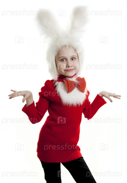 Маленькая девочка в костюме зайчика на белом фоне