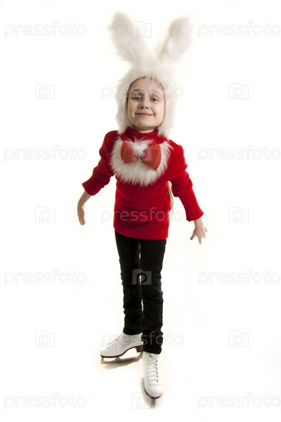 Маленькая девочка в костюме зайчика на белом фоне