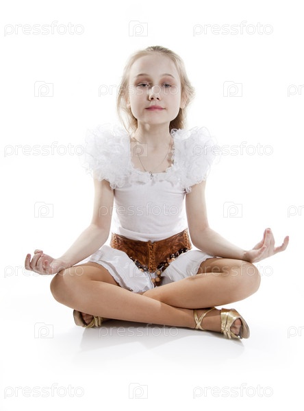 Маленькая девочка сидит на полу в позе лотоса на белом фоне