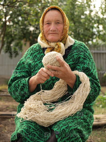Пожилая женщина с пряжей в саду