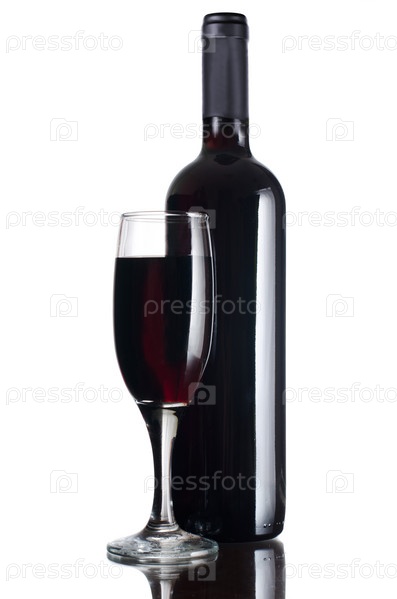 Фужер и бутылка красного вина на белом фоне