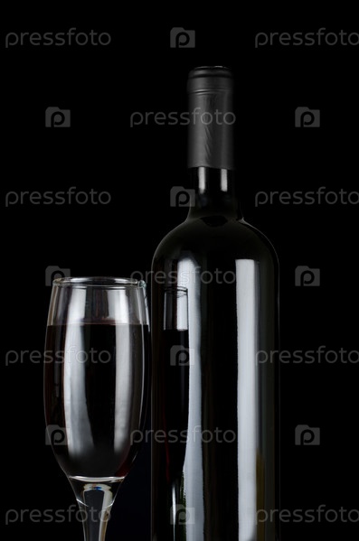 Фужер и бутылка красного вина на черном фоне