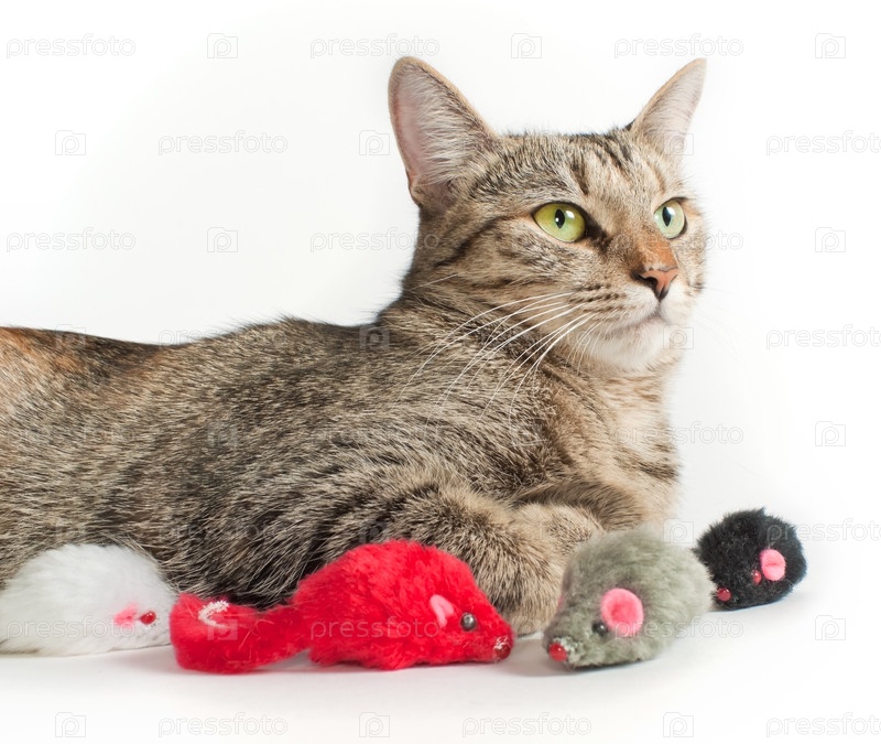 Кот с игрушечными мышами на белом фоне