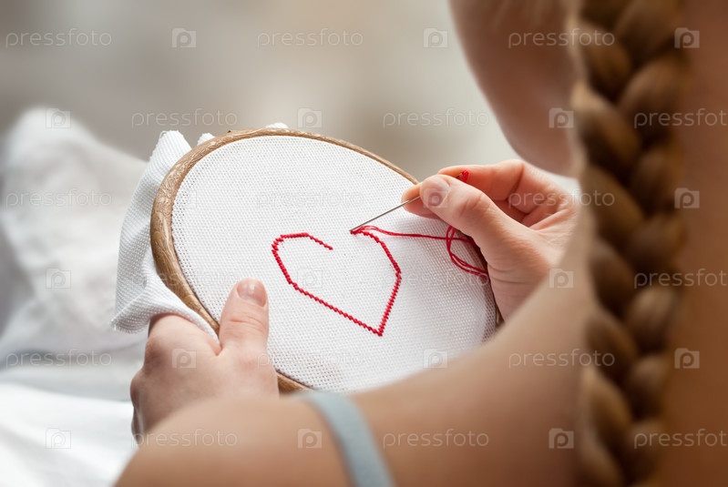 Девушка с косой вышивает красное сердце