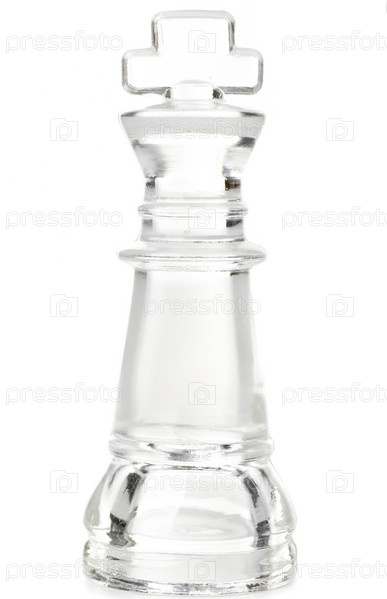 Стеклянная шахматная фигура белого короля, изолированная на белом фоне
