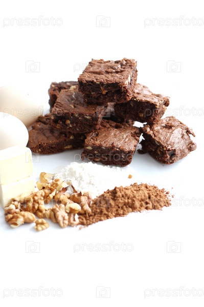 Десерт и ингредиенты для его приготовления: какао, грецкие орехи, яйцо, мука и маргарин