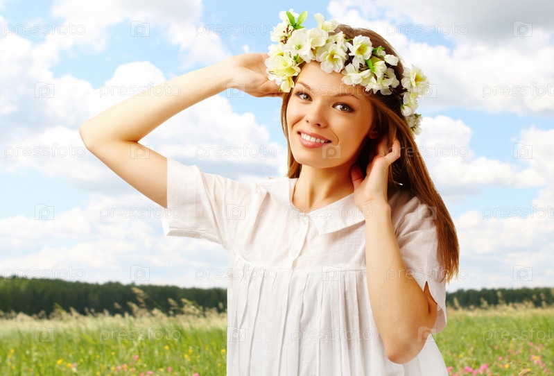 Красивая девушка в венке из цветов на фоне природы