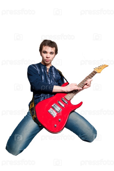Молодой мужчина с электрической гитарой на белом фоне