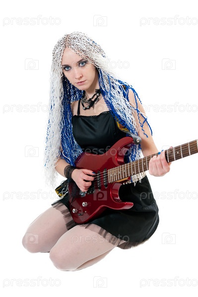 Молодая девушка с электрической гитарой на белом фоне