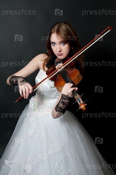 Молодая девушка в белом платье, играющая на скрипке на черном фоне