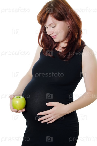 Беременная женщина с яблоком на белом фоне