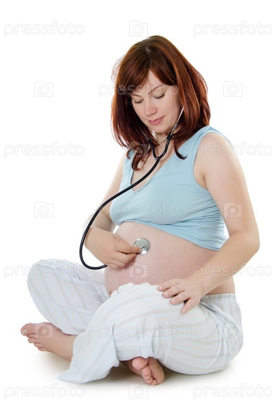 Беременная женщина слушает сердцебиение ребенка при помощи фонендоскопа