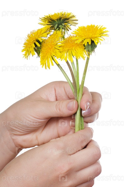 Букет из желтых одуванчиков в женских руках на белом фоне