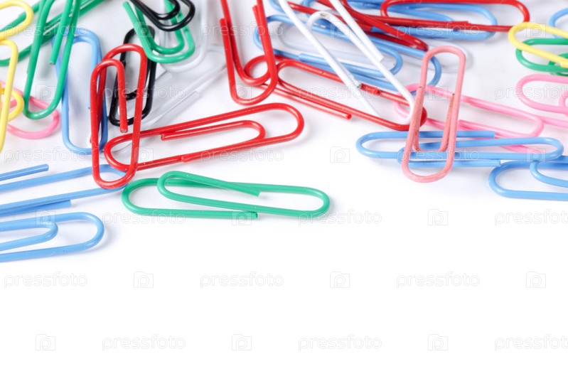 Разноцветные скрепки крупным планом на белом