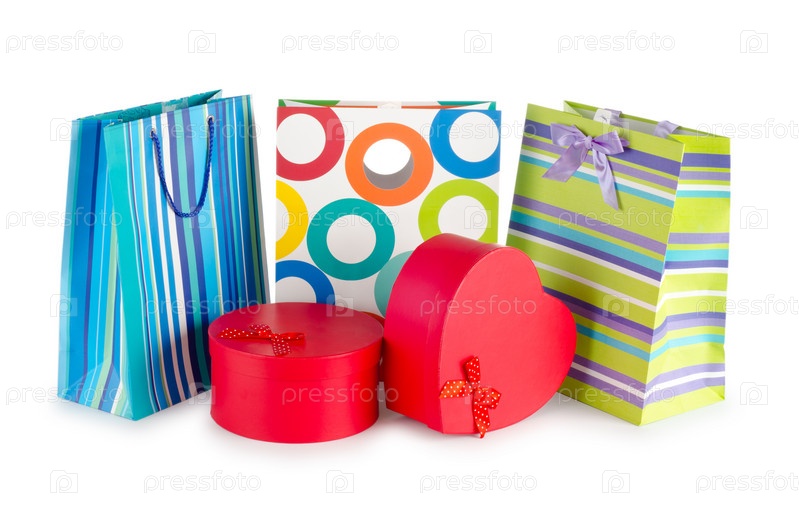 Красочные пакеты и подарочные коробки, изолированы на белом