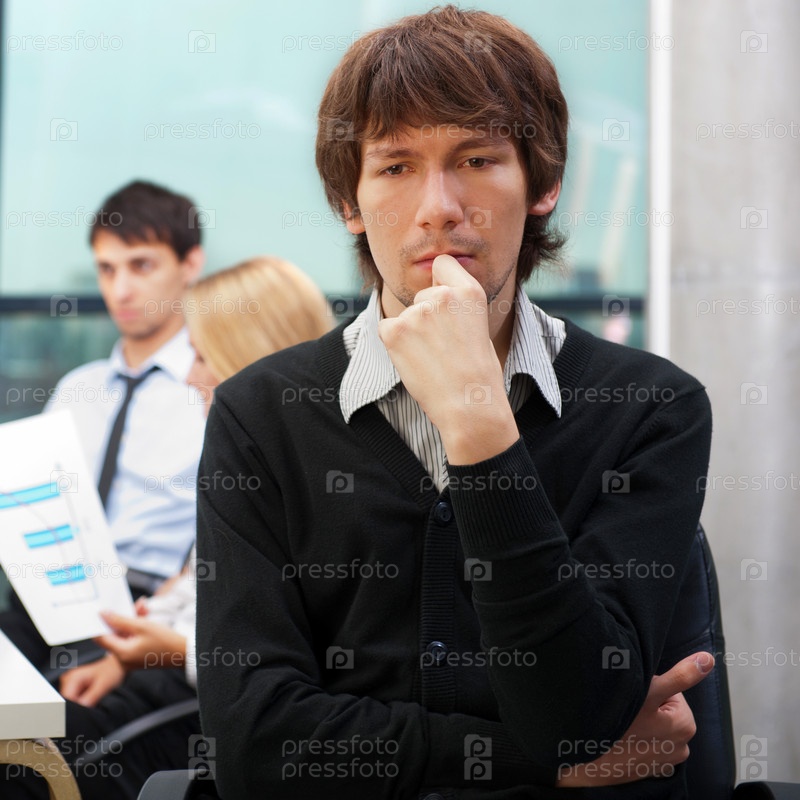 Размышляющий бизнесмен в офисе с партнерами по бизнесу