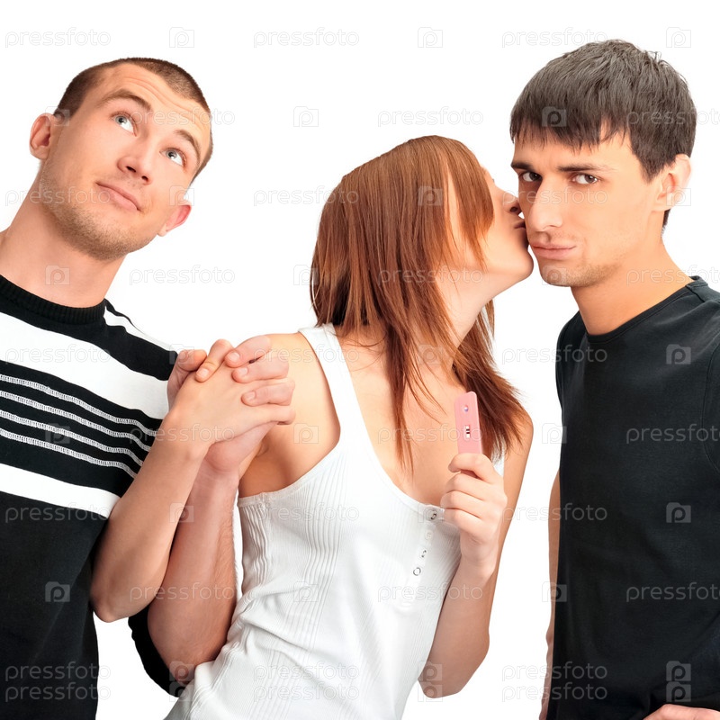 Девушка с положительным тестом на беременность и двое мужчин думают об отцовстве