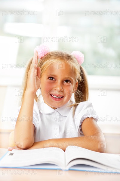 Улыбающаяся школьница с поднятой рукой на уроке