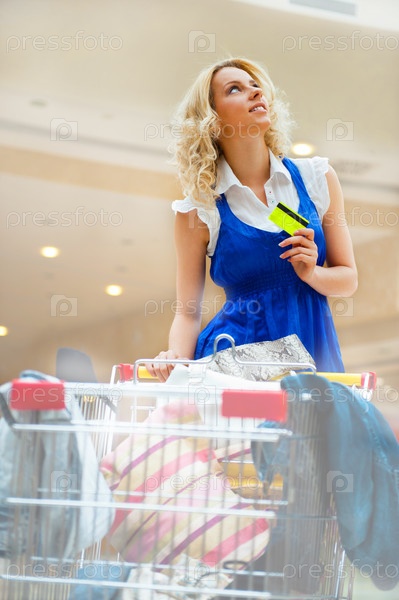 Молодая женщина с кредитной картой и корзиной с покупками