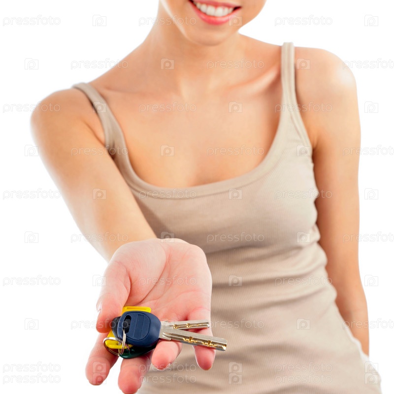 Молодая женщина протягивает ключи от квартиры