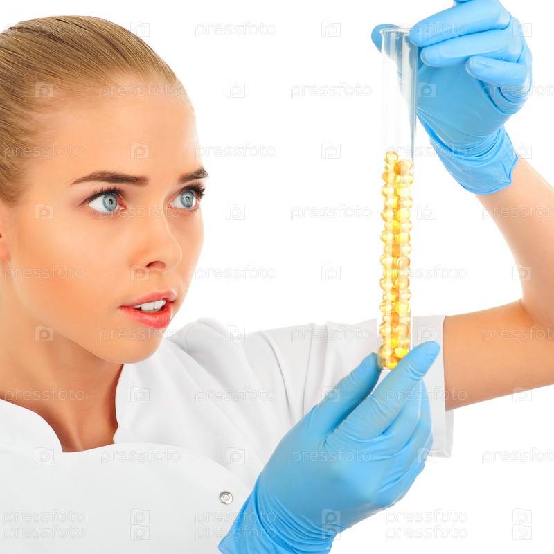 Женщина-лаборант рассматривает содержимое пробирки