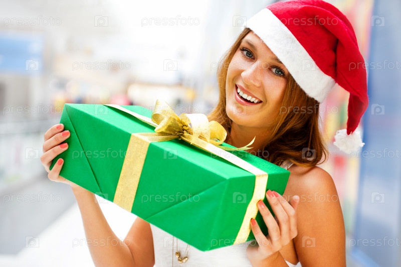 Девушка в шапке Санта Клауса с подарком в руках