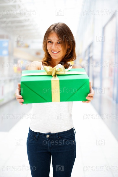 Красивая брюнетка в торговом центре с подарком в руках