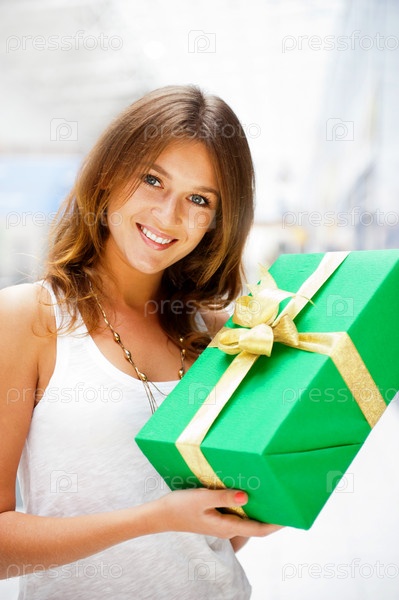 Красивая брюнетка в торговом центре с подарком в руках