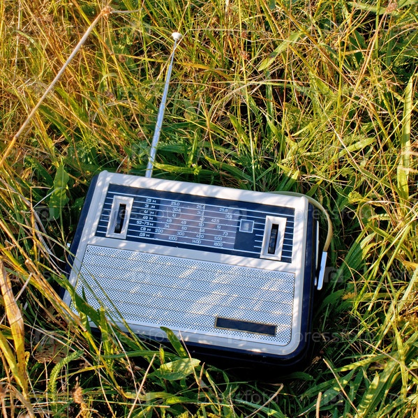 Ретро радиоприемник в зеленой луговой траве