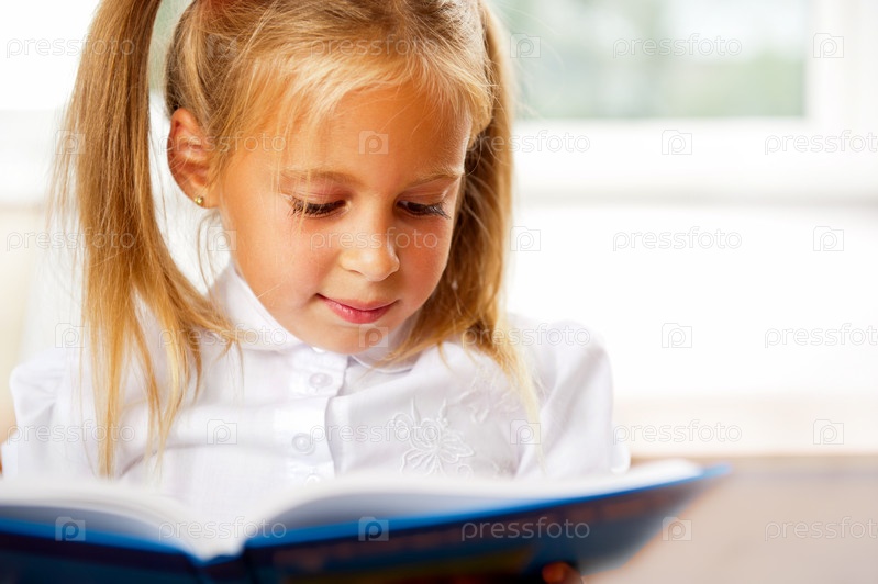 Девочка читает книгу, сидя за партой