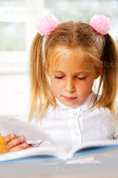 Девочка читает книгу, сидя за партой