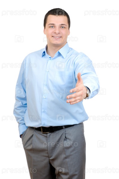Красивый бизнесмен приветствует изолированного на белом фоне