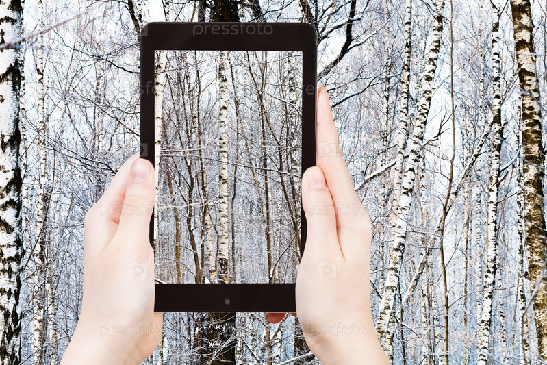 Человек фотографирует березы в зимнем лесу
