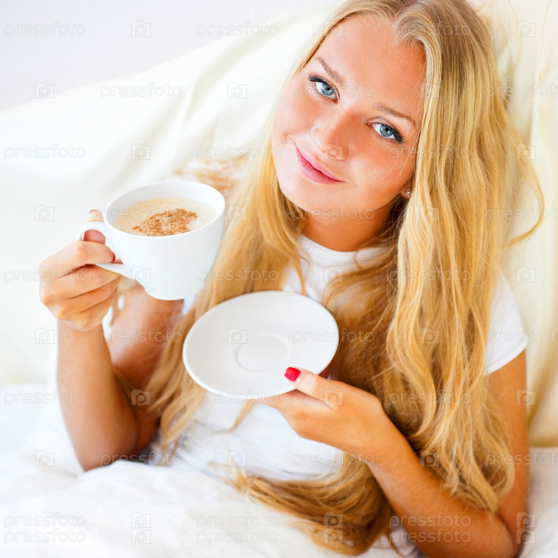 Молодая симпатичная блондинка пьет кофе в постели