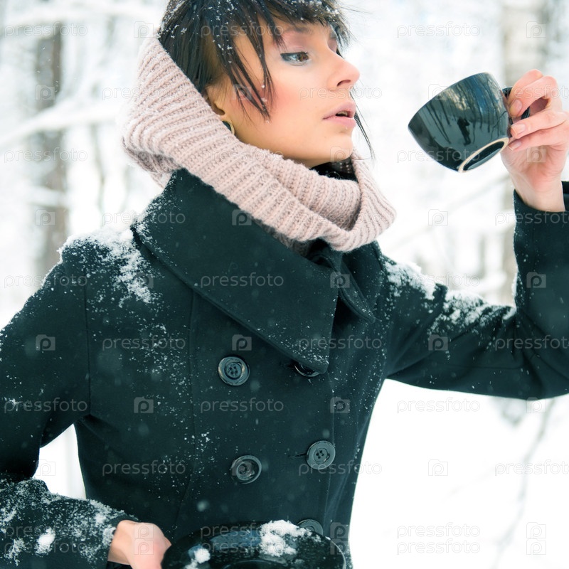 Одинокая женщина в зимнем парке пьет кофе