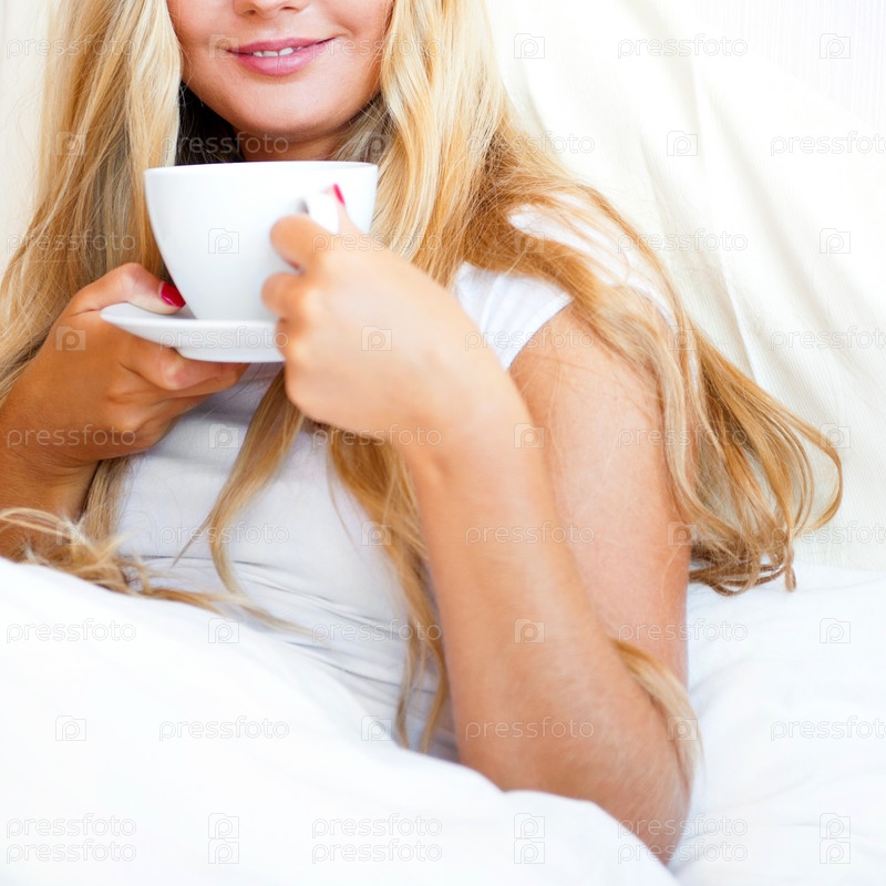 Молодая симпатичная блондинка в постели с чашкой и блюдцем
